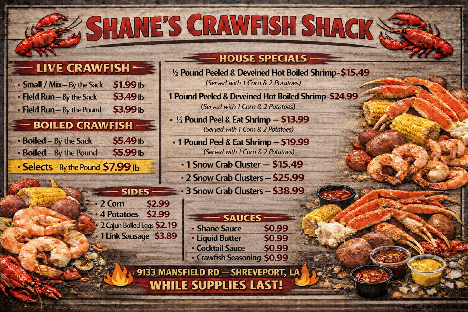 In the mood for something different? Stop by Shane's Crawfish Shack in Shreveport for a true bayou-style feast. Our local crawfish restaurant offers an authentic shack vibe and tastes of the South. We make sure to fill every bite with flavor, love and tradition. From fresh crawfish by the pound to boiled shrimp and potatoes, our friendly, casual atmosphere is the perfect place to unwind and enjoy the spirit of Louisana at your table.